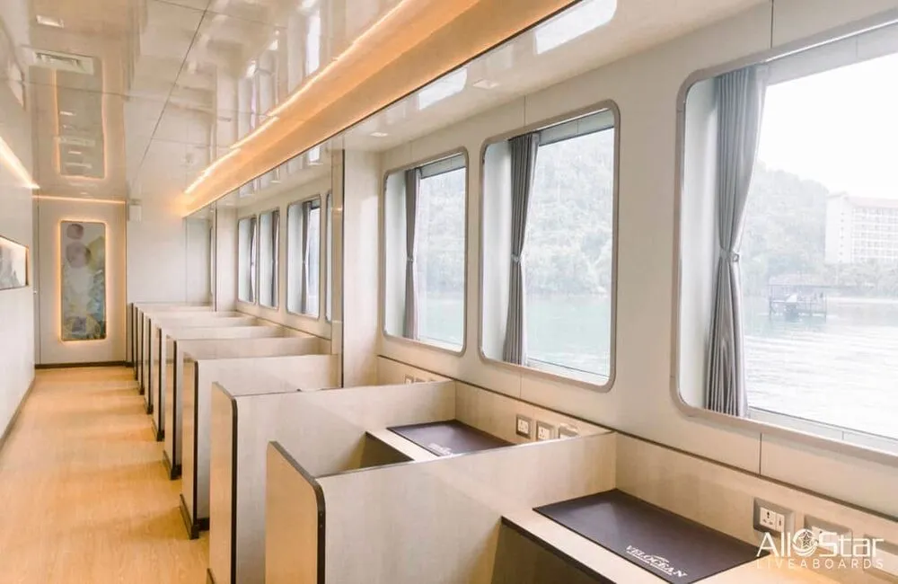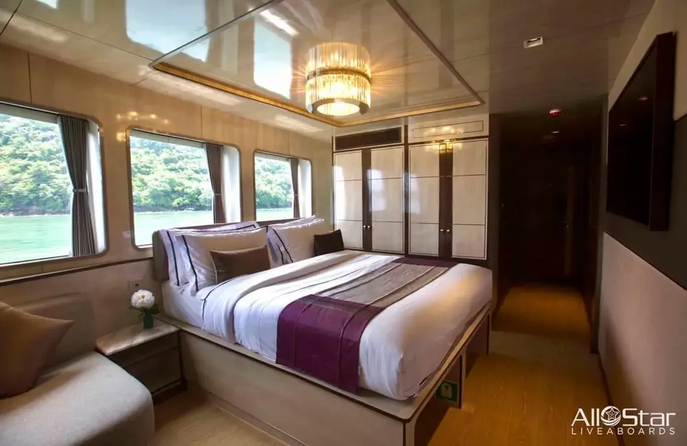 Hors norme dans sa catégorie, ce luxueux bateau de croisière plongée a été conçu spécifiquement pour les plongeurs. Avec un équipage de 24 membres, les passagers peuvent s’attendre à un service haut de gamme et entièrement personnalisé. Ce navire élégant, récemment construit, mesure 52 m et offre trois ponts d’espaces de vie dotés de mobilier moderne et confortable dans des tons chaleureux. Les dix suites spacieuses, équipées de larges baies vitrées avec vue sur l’océan, redéfinissent le standard des croisières plongée. Le pont plongée et les stations d’équipement sont parfaitement adaptés aux conditions exceptionnelles de l’Indonésie.