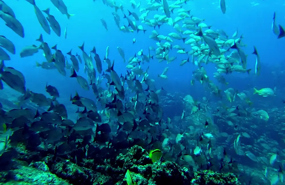 La vie marine à Nosara est très variée et chaque plongée est différente : requins pointe blanche, raies manta, raies aigle, baleines de passage en saison, parfois des nudibranches, murènes, et de nombreux bancs de poissons de toutes sortes.